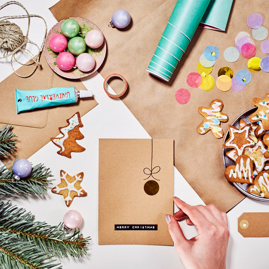 Jetzt kannst du noch vor der nahenden Silvesterparty deine Konfetti-Bestände auspacken, denn wir haben uns eine Weihnachtskarte überlegt, bei der es so richtig bunt werden darf. Mit den anderen Materialien bleiben wir eher schlicht, also such dir ein schönes Kraftpapier und einen schwarzen Filzstift.